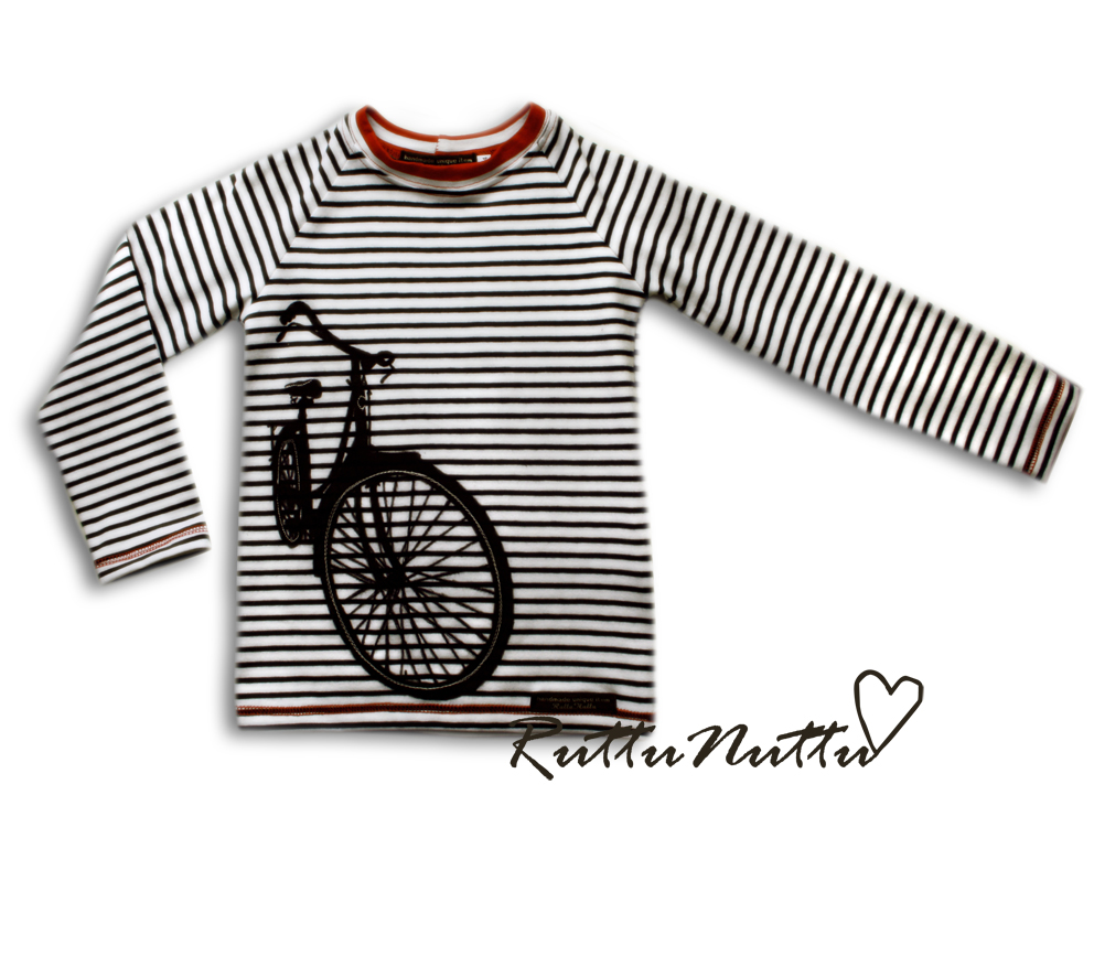 Sen ajan mitä suurin osa tuntuu pitäneen ns. kankaatonta helmikuuta, minä olen ihan urakalla hamstrannut itselleni erilaisia raitatrikoita. Testasin tällä kertaa myös hieman laatikon pohjalle kerääntyneitä kangastusseja. Polkupyörän kuva löytyi netistä ja on tosiaan tussattu suoraan kankaalle. Lisäsin muutamia ykstyiskohtia vielä ompelukoneella suoraompeleella tikaten. Musta-valkoraidallinen trikoo on ostettu Fabriinasta.
